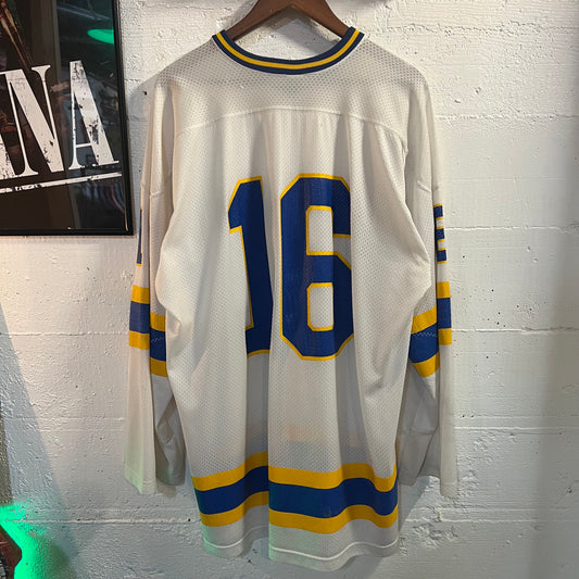 Vintage 1980's Champion Regents Hockey Jersey - Size XL (48) - Made In USA - White/Blue/Yellow
