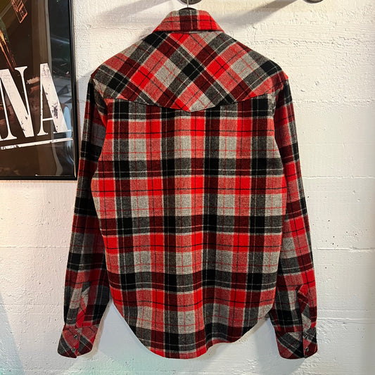 Vintage Hand Made Pearl Snap Southwestern Wool Plaid Flannel - Size Large - Red/Grey/White/Black