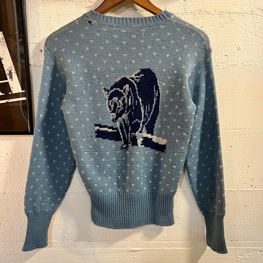 True Vintage 30's/40's Wool Intarsia Knit Bear Sweater - Size Small - Blue/White/Navy