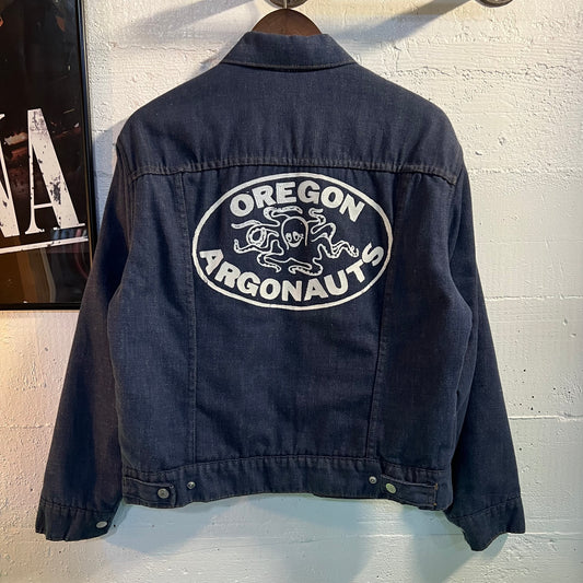 Vintage 1960's JCPenney Ranchcraft Quilt Lined 'Oregon Argonauts' Denim Jacket - Size M/L - Dark Raw Indigo/Red