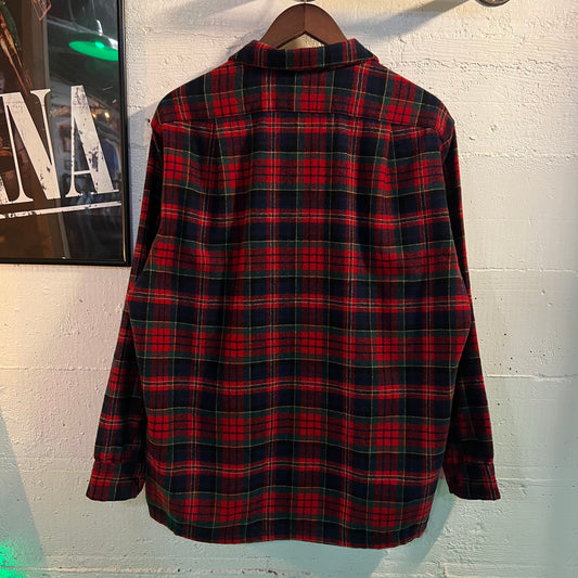 Vintage 60's/70's Pendleton Plaid Virgin Wool Board Shirt W/ Loop Collar - Size Large - Made In USA - Red/Green/Blue/Yellow