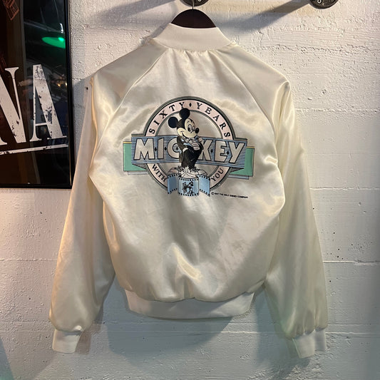 Vintage 1987 Walt Disney Mickey Mouse 60 Year Anniversary Satin Bomber Jacket - Size Small - White - Chalk Line