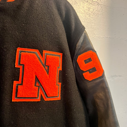 Vintage 90's Leather Varsity Letterman Jacket With Chenille Patch - Size XL - Made In USA - Orange/Black