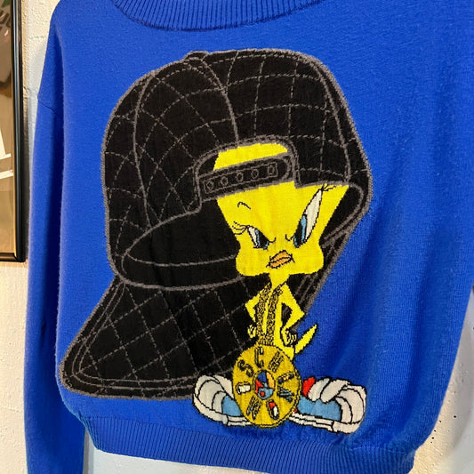 Vintage Distressed Moschino Couture Looney Tunes ‘Tweety Bird’ Knitted Sweater - Size Small - Blue/Multicolored - Made In Italy