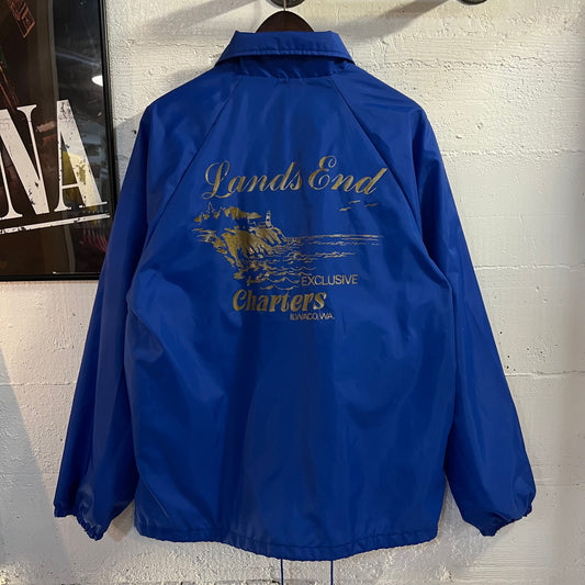 Vintage Auburn Sportswear 'Lands End Charters, Ilwaco WA' Nylon Coaches Jacket - Size Large - Made In USA - Blue/Gold
