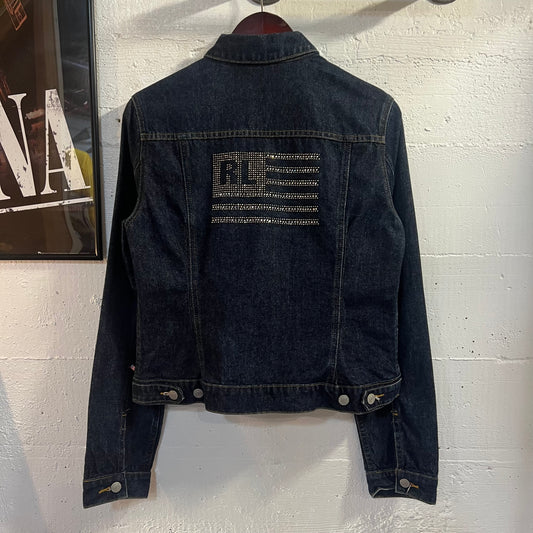 Vintage Polo Jeans Co. Ralph Lauren Rhinestone Flag Denim Trucker Jacket - Size XL - Raw Dark Indigo