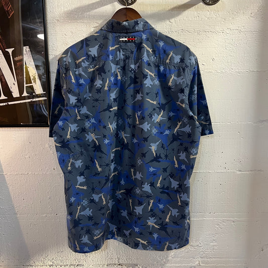 Vintage 90's Tommy Hilfiger Tommy Jeans All Over Print Fighter Jet Camo Short Sleeve Button Up Shirt - Size Medium - Navy/Blue