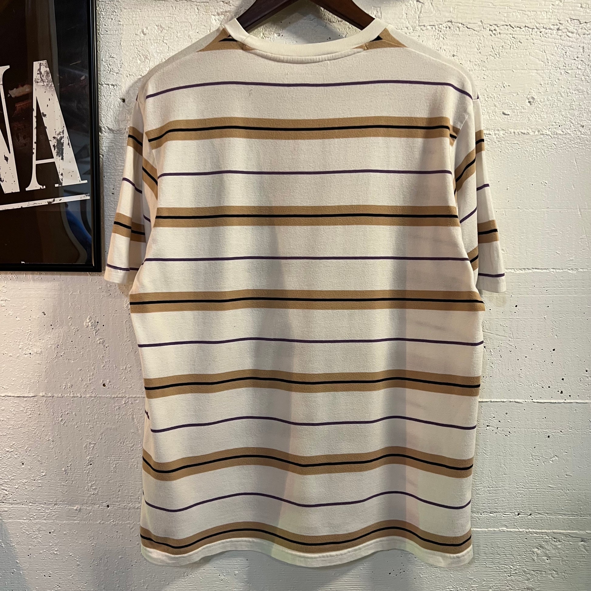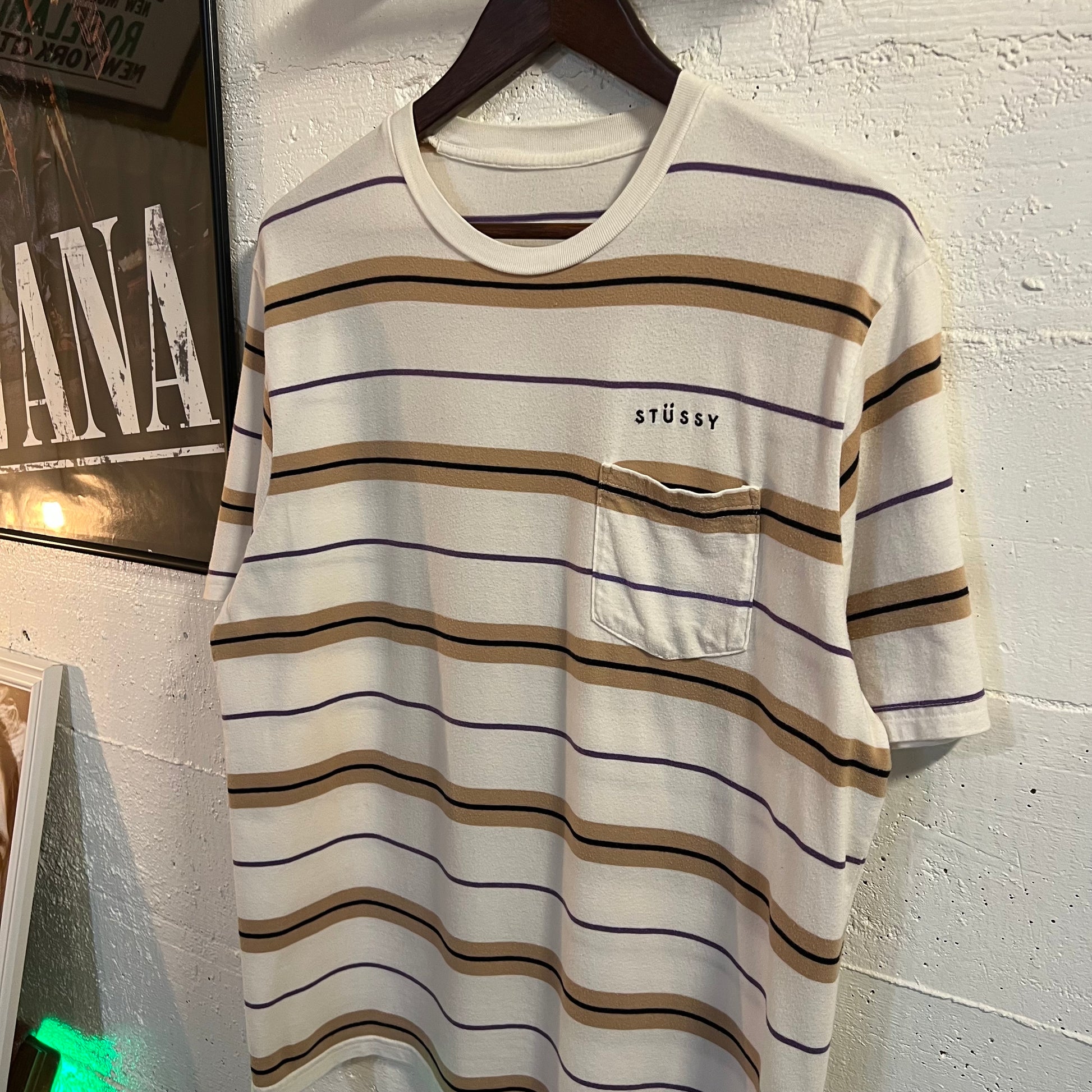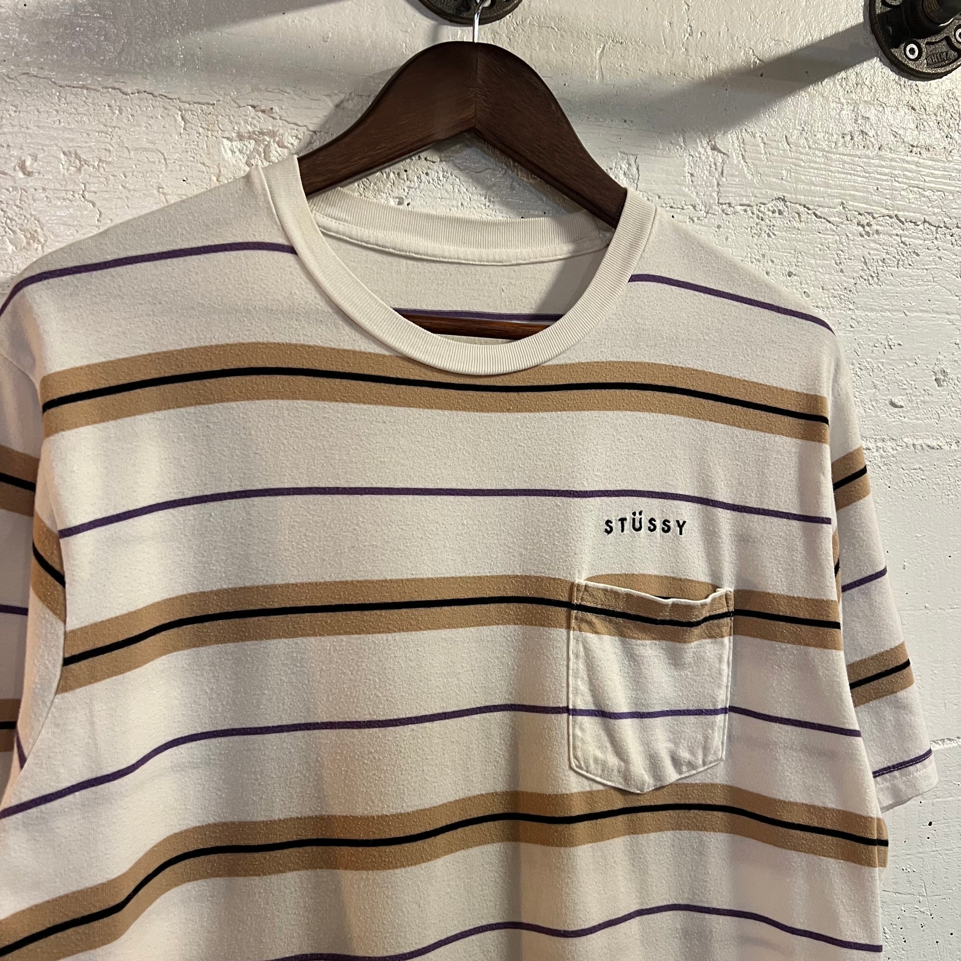 *Pre-Owned* Stüssy Embroidered Logo Striped Pocket T-Shirt - Size Medium - White/Beige/Violet