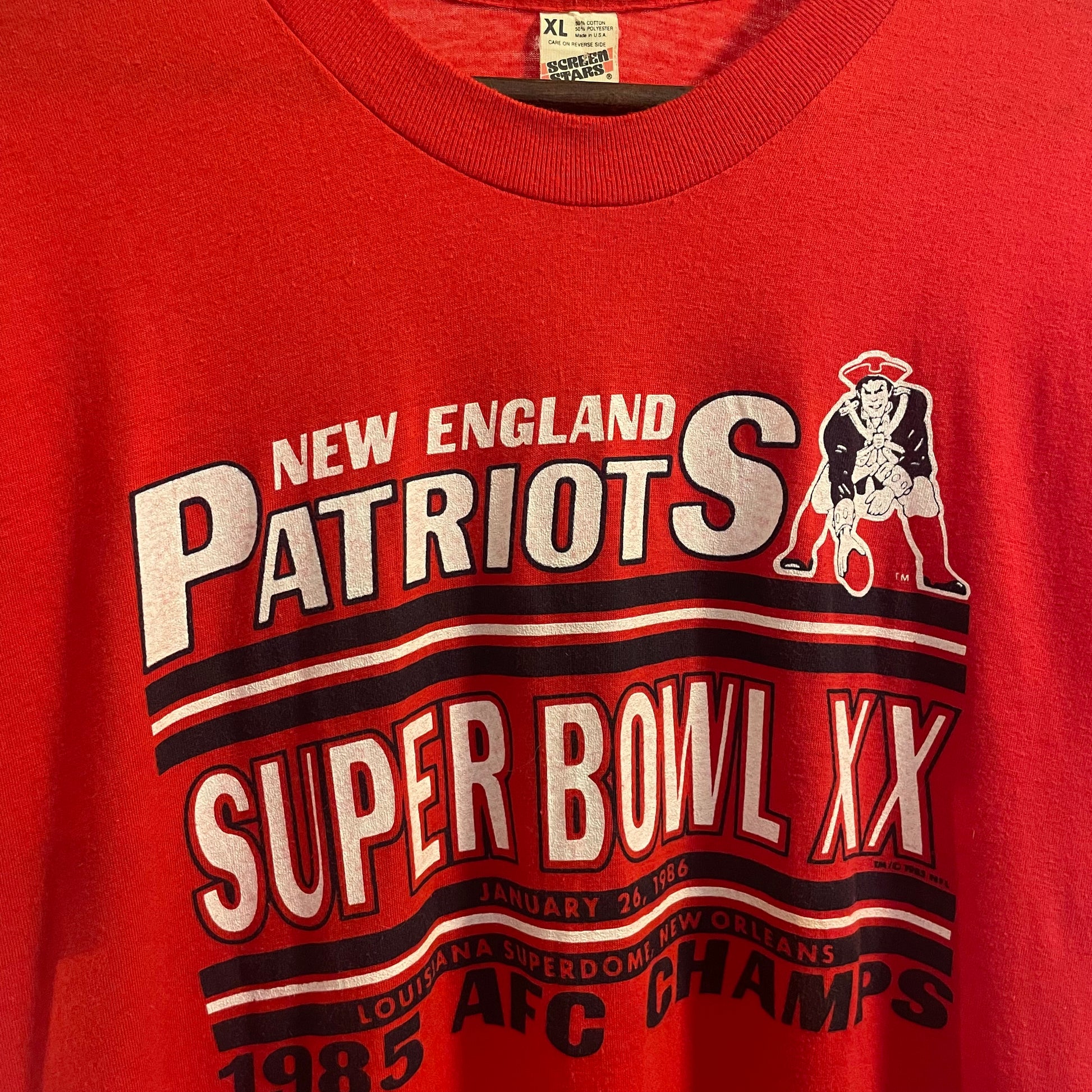 Vintage 1985 New England Patriots ‘Super Bowl XX’ Single Stitch T-Shirt - Size XL - Made In USA - Red/Black/White