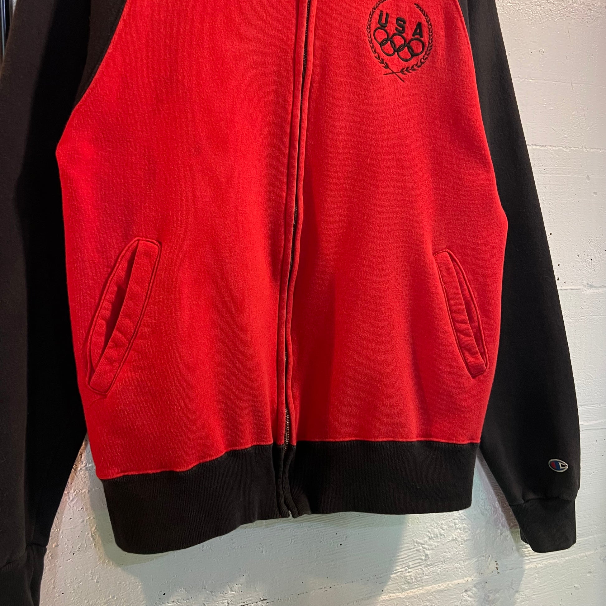 Vintage Embroidered Champion Olympic Zippered Crewneck Sweatshirt - Size Large - Made In USA - Black/Red